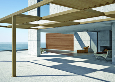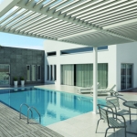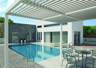 Πέργκολα σε απλή γραμμή, ευπροσάρμοστη σε κάθε χώρο και αρχιτεκτονική. Μεγάλο πλεονέκτημα, η χρήση ανοιγοκλεινόμενων περσίδων με μοτέρ.